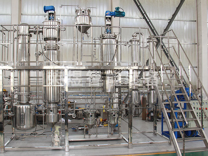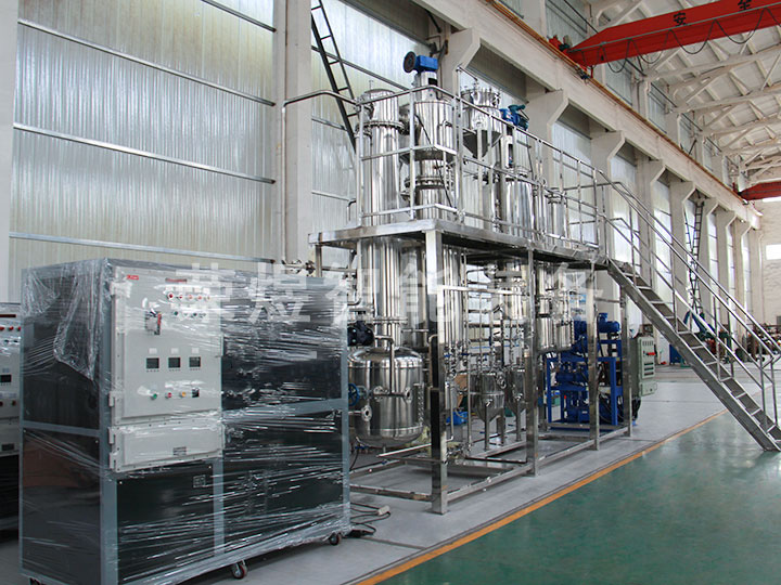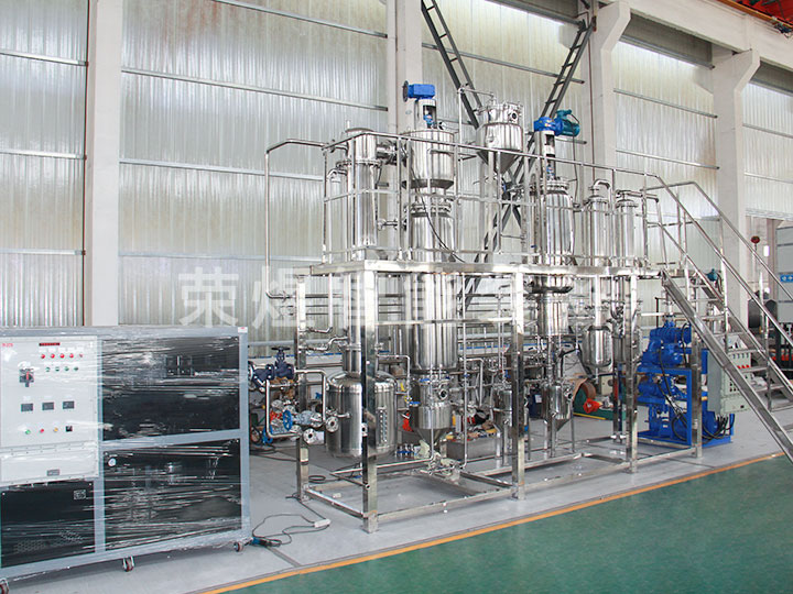 结构:本设备主要包括薄膜蒸发器、一级冷凝器、二级冷凝器、原料罐、成品罐、低沸点罐、高沸点罐等部件组成,全部由不锈钢制造。